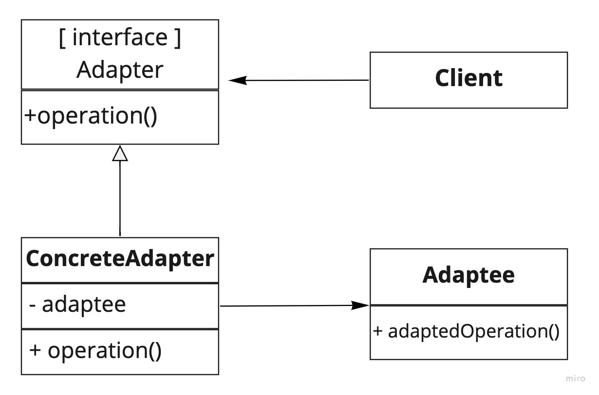 한 클래스의 인터페이스가 다른 클래스로 변환되는 구조적 패턴입니다.