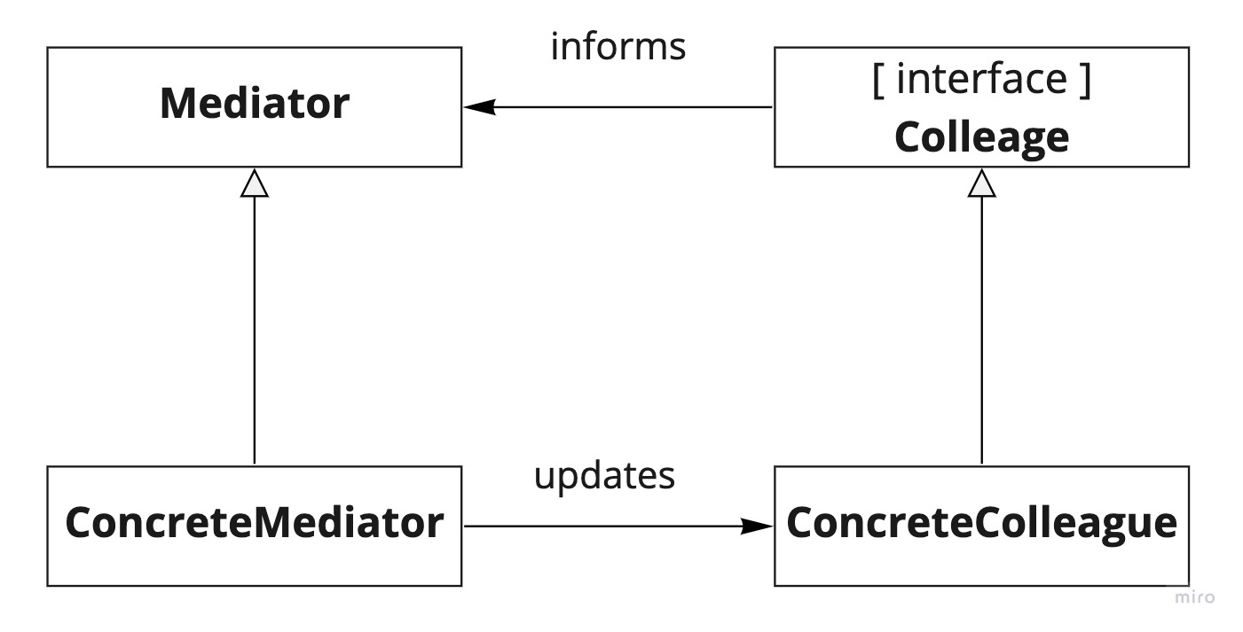 // using Iterator class IteratorClass { constructor(data) { this.index = 0; this.data = data; } [Symbol.iterator]() { return { next: () => { if (this.index < this.data.length) { return { value: this.data[this.index++], done: false }; } else { this.index = 0; // to reset iteration status return { done: true }; } }, }; } } // using Generator function* iteratorUsingGenerator(collection) { var nextIndex = 0; while (nextIndex < collection.length) { yield collection[nextIndex++]; } } // usage const gen = iteratorUsingGenerator(['Hi', 'Hello', 'Bye']); console.log(gen.next().value); // 'Hi' console.log(gen.next().value); // 'Hello' console.log(gen.next().value); // 'Bye'Mediator Pattern