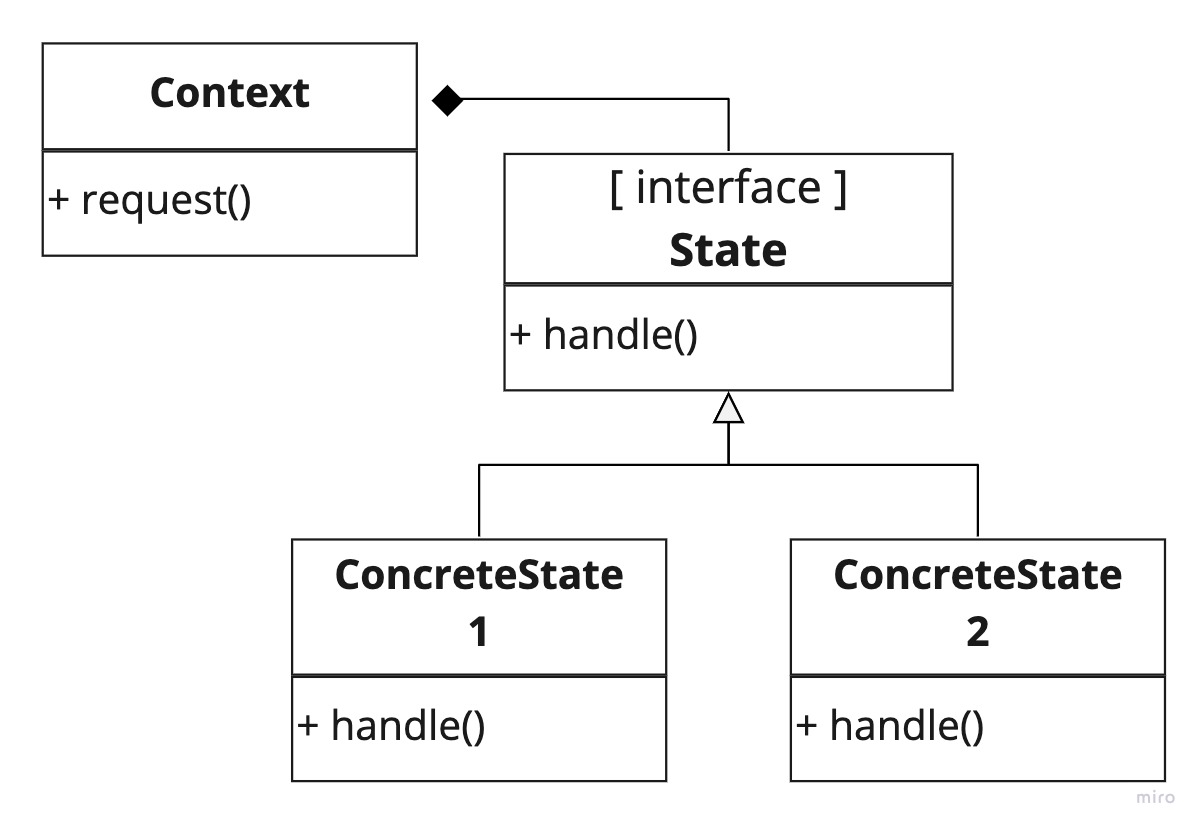 객체가 내부 state 변화에 따라 행동을 변경할 수 있도록 하는 패턴입니다.