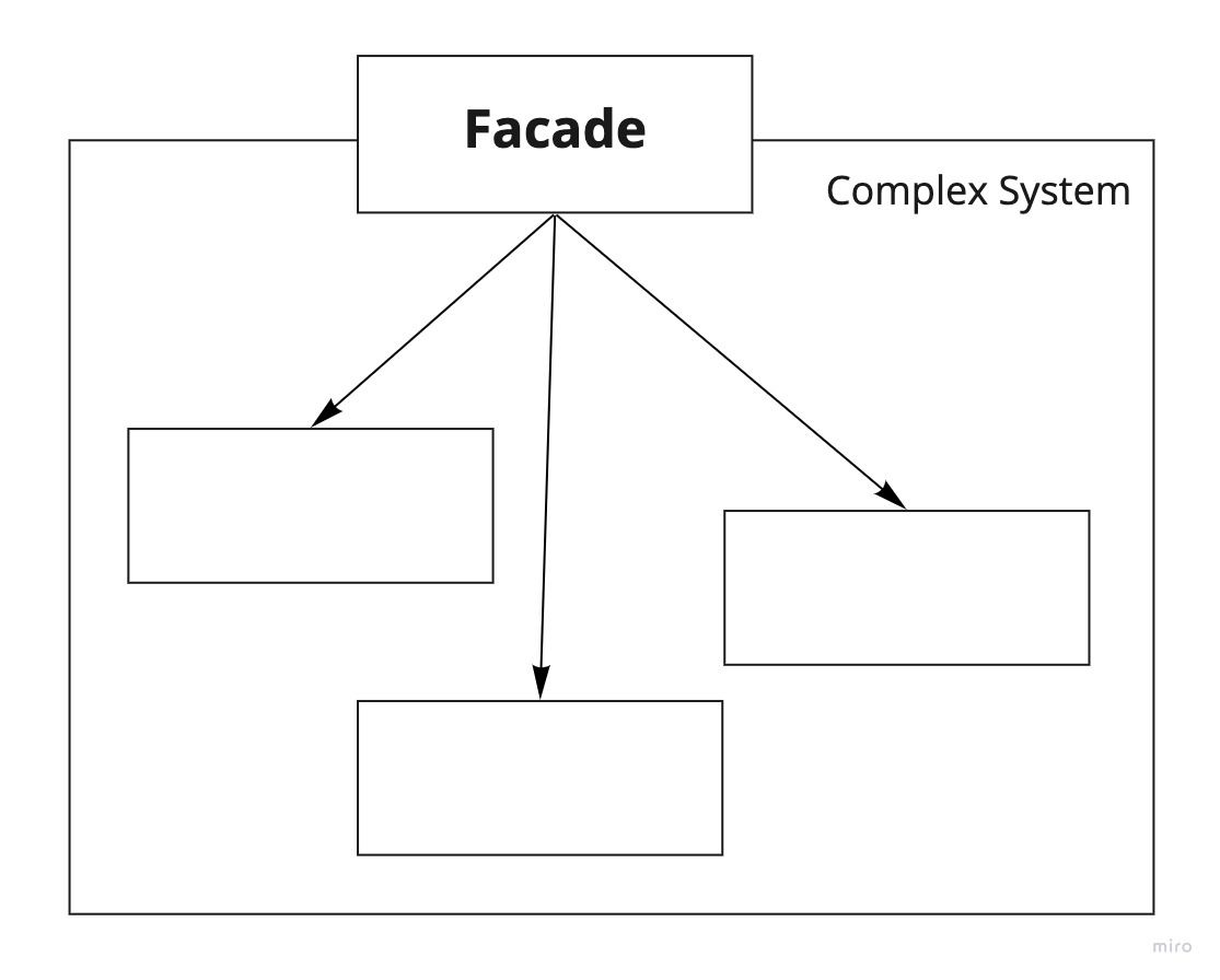 하위 시스템 쪼는 하위 클래스의 복잡성을 방지하는 사용 편의성을 위해 통합되고 더 간단한 공용 인터페이스를 제공하는데 사용됩니다. jQuery와 같은 라이브러리에서 매우 일반적입니다.