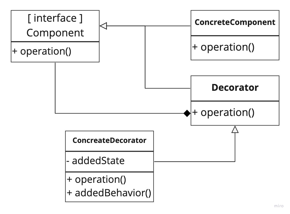 class Component { constructor(name) { this._name = name; } getNodeName() { return this._name; } // abstract methods that need to be overridden getType() {} addChild(component) {} removeChildByName(componentName) {} removeChildByIndex(index) {} getChildByName(componentName) {} getChildByIndex(index) {} noOfChildren() {} static logTreeStructure(root) { let treeStructure = ''; function traverse(node, indent = 0) { treeStructure += `${'--'.repeat(indent)}${node.getNodeName()}\n`; indent++; for (let i = 0, length = node.noOfChildren(); i < length; i++) { traverse(node.getChildByIndex(i), indent); } } traverse(root); return treeStructure; } } class Leaf extends Component { constructor(name) { super(name); this._type = 'Leaf Node'; } getType() { return this._type; } noOfChildren() { return 0; } } class Composite extends Component { constructor(name) { super(name); this._type = 'Composite Node'; this._children = []; } getType() { return this._type; } addChild(component) { this._children = [...this._children, component]; } removeChildByName(componentName) { this._children = [...this._children].filter(component => component.getNodeName() !== componentName); } removeChildByIndex(index) { this._children = [...this._children.slice(0, index), ...this._children.slice(index + 1)]; } getChildByName(componentName) { return this._children.find(component => component.name === componentName); } getChildByIndex(index) { return this._children[index]; } noOfChildren() { return this._children.length; } } // usage const tree = new Composite('root'); tree.addChild(new Leaf('left')); const right = new Composite('right'); tree.addChild(right); right.addChild(new Leaf('right-left')); const rightMid = new Composite('right-middle'); right.addChild(rightMid); right.addChild(new Leaf('right-right')); rightMid.addChild(new Leaf('left-end')); rightMid.addChild(new Leaf('right-end')); // log console.log(Component.logTreeStructure(tree)); /* root --left --right ----right-left ----right-middle ------left-end ------right-end ----right-right */Decorator Pattern