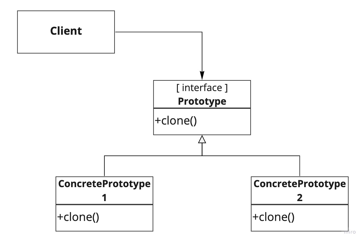 class BallFactory { constructor() { this.createBall = function(type) { let ball; // 매개변수에 따라서 위임받는 클래스가 다르다. if (type === 'football' || type === 'soccer') ball = new Football(); else if (type === 'basketball') ball = new Basketball(); // 위임받은 클래스에 메서드 할당 ball.roll = function() { return `The ${this._type} is rolling.`; }; return ball; }; } } class Football { constructor() { this._type = 'football'; this.kick = function() { return 'You kicked the football.'; }; } } class Basketball { constructor() { this._type = 'basketball'; this.bounce = function() { return 'You bounced the basketball.'; }; } } // 객체 생성 const factory = new BallFactory(); const myFootball = factory.createBall('football'); const myBasketball = factory.createBall('basketball'); // Football 클래스 console.log(myFootball.roll()); // The football is rolling. console.log(myFootball.kick()); // You kicked the football. // Basketball 클래스 console.log(myBasketball.roll()); // The basketball is rolling. console.log(myBasketball.bounce()); // You bounced the basketball.Prototype Pattern