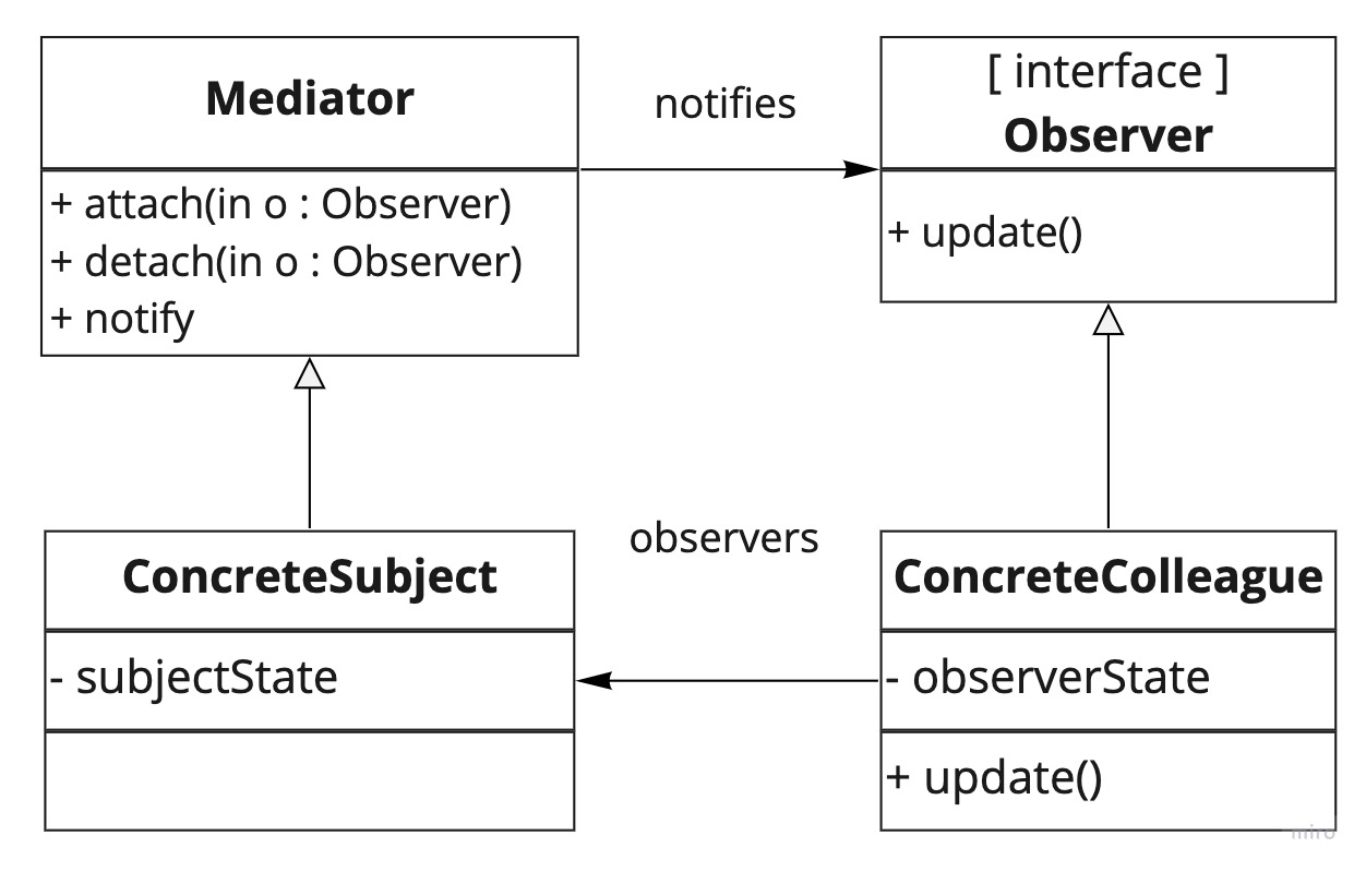 더보기객체 집합이 서로 상호 작용하는 방식을 캡슐화하는 동작 패턴입니다.
