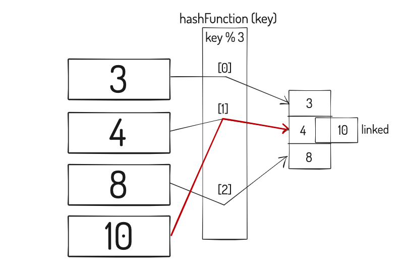 이미 데이터가 들어간 인덱스에 또 다른 데이터를 연결 리스트(Linked List) 또는 트리 (Tree) 형태로 더하는 방법입니다.