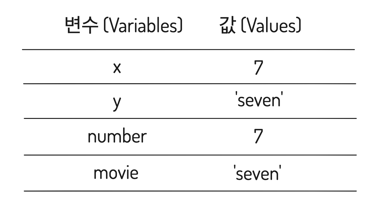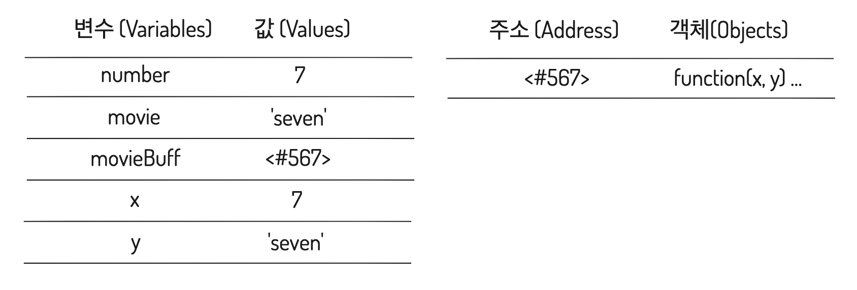 let x = 7; let y = 'seven'; let number = x; let movie = y; console.log(x, y, number, movie); // 7, 'seven', 7, 'seven'컴퓨터 메모리 상에 x와 number, y와 movie가 같은 값을 가지고 있지만 서로 분리되어 있습니다.